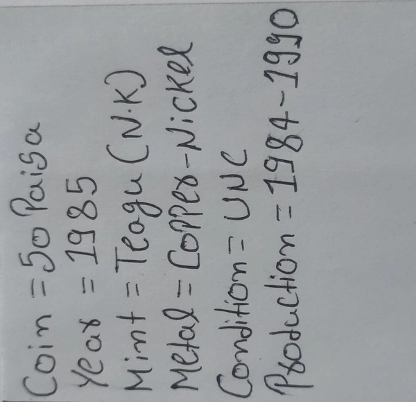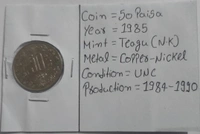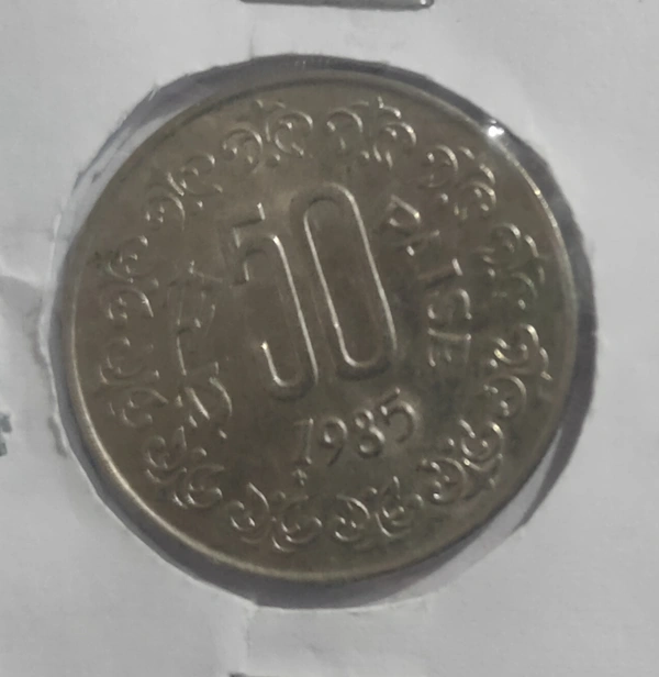 Coin - 50 Paisa, Year - 1885, Mint Teagu, Metal - Copper-Nickel, Period - 1984 to 1990, Weight - 5.09 gram, Diameter - 24mm, Thickness - 1.5mm, Coin Condition - UNC(Uncirculated Condition)